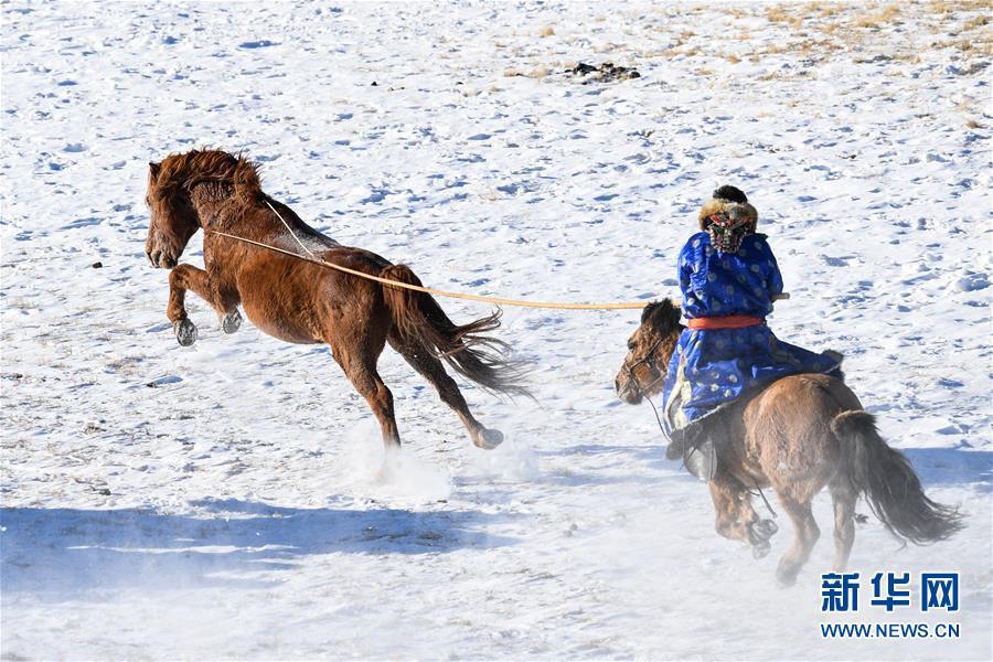 1月8日,牧民進(jìn)行套馬表演。 時(shí)下正值草原冬季旅游旺季,內(nèi)蒙古自治區(qū)西烏珠穆沁旗的牧民們?cè)谘┰弦徽股硎郑瑸橛慰驼宫F(xiàn)獨(dú)特的民族風(fēng)情。 新華社記者 劉磊 攝