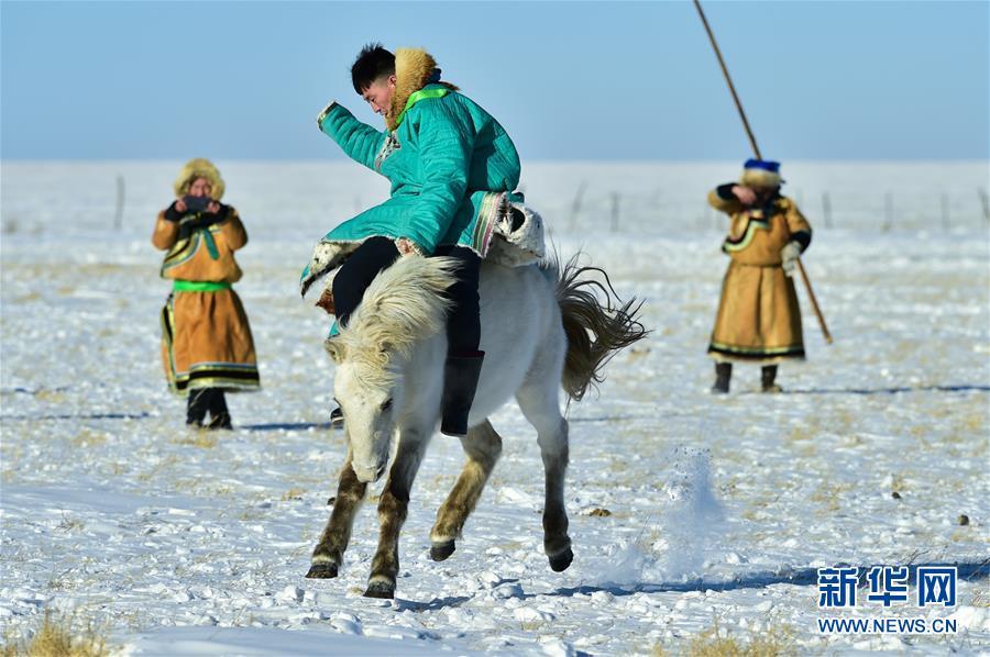 1月8日,牧民在馴服一匹烈馬。 時(shí)下正值草原冬季旅游旺季,內(nèi)蒙古自治區(qū)西烏珠穆沁旗的牧民們?cè)谘┰弦徽股硎郑瑸橛慰驼宫F(xiàn)獨(dú)特的民族風(fēng)情。 新華社記者 鄒予 攝