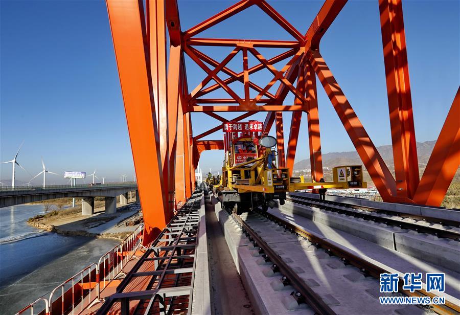 1月13日,中鐵三局的工人在京張高鐵官廳水庫特大橋進行鋪軌作業(yè)。 新華社記者 楊世堯 攝
