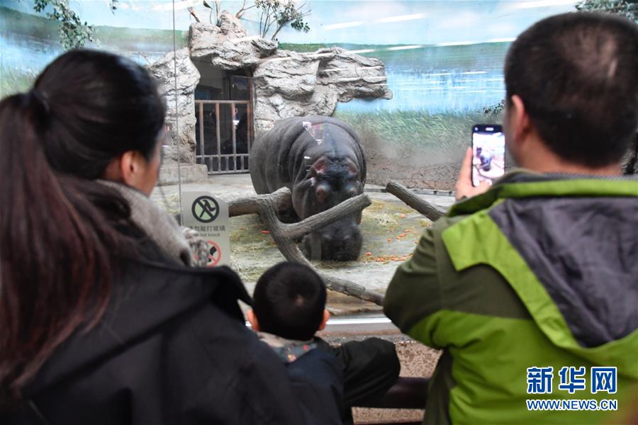 1月13日,游客在北京動物園恒溫的河馬館內(nèi)觀賞河馬。