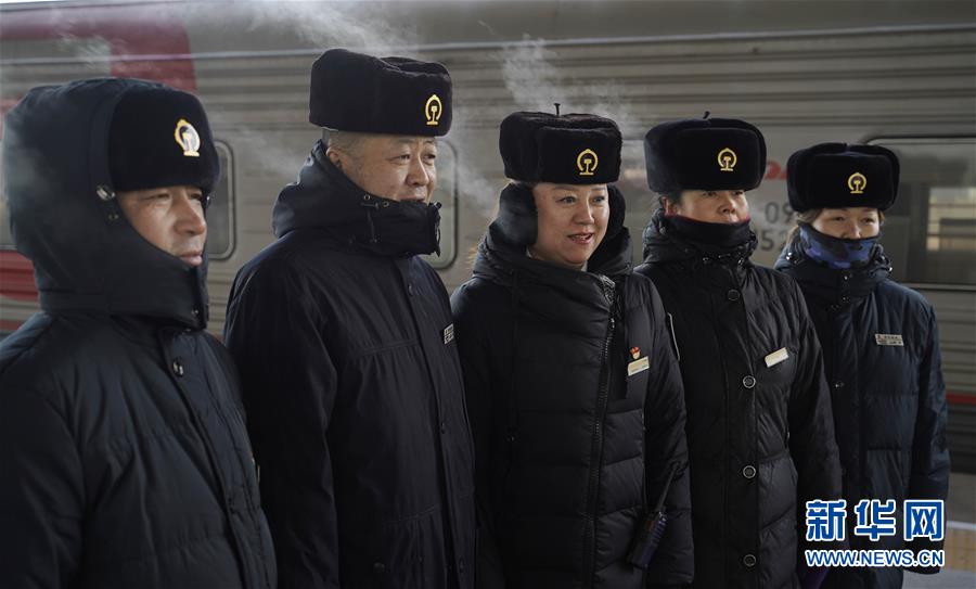 1月11日,在滿洲里火車站站臺,“金鑰匙”服務(wù)臺客運員在嚴寒中等待列車進站。