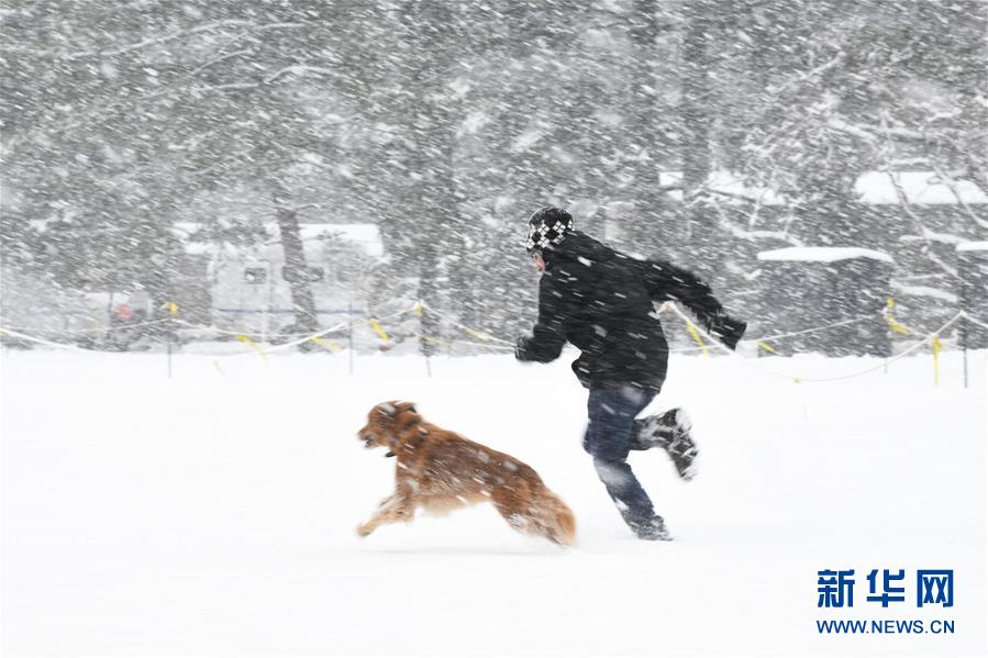 1月13日,在美國首都華盛頓,一名男子與寵物狗在林肯紀(jì)念堂旁玩耍。 近日,美國首都華盛頓及其周邊地區(qū)普降暴雪。降雪導(dǎo)致部分航班晚點或取消,道路交通事故增多。 新華社記者 劉杰 攝