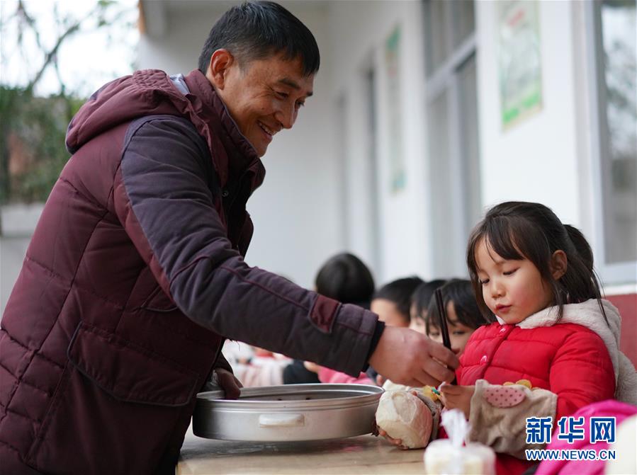 1月3日,章站亮(前左)給一位學(xué)生品嘗剛出鍋的土豆燒肉。 新華社記者 胡晨歡 攝