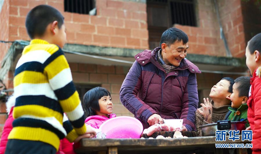 1月3日,章站亮(左三)在學(xué)校的操場上切肉。由于學(xué)校沒有室內(nèi)的廚房和食堂,章站亮只能在露天的環(huán)境下為學(xué)生們準(zhǔn)備餐點(diǎn)。 新華社記者 胡晨歡 攝