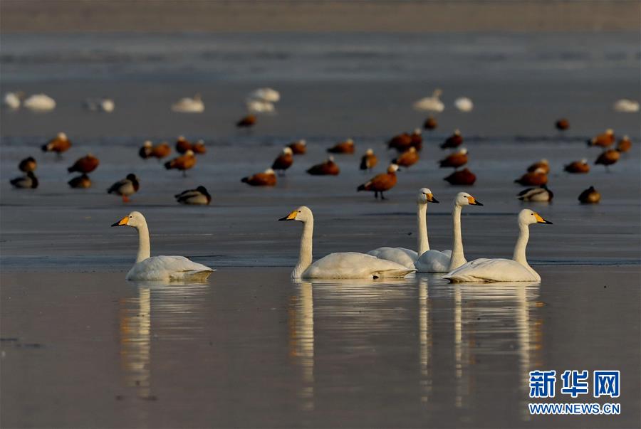 1月13日,天鵝等水鳥在張家口市宣化區(qū)洋河水庫休憩。 近年來,河北省張家口市宣化區(qū)立足京津冀生態(tài)涵養(yǎng)區(qū)的功能定位,不斷加大環(huán)境治理和生態(tài)功能修復力度,使洋河水庫及周邊濕地成為天鵝、大雁、野鴨、灰鶴等多種鳥類南北遷徙中的棲息地。 新華社記者楊世堯攝