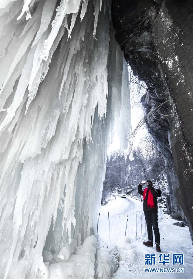 1月12日,游客在涉縣太行五指山景區(qū)觀賞冰瀑。新華社記者王曉攝