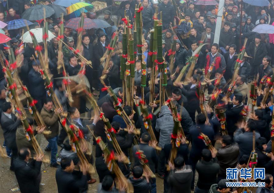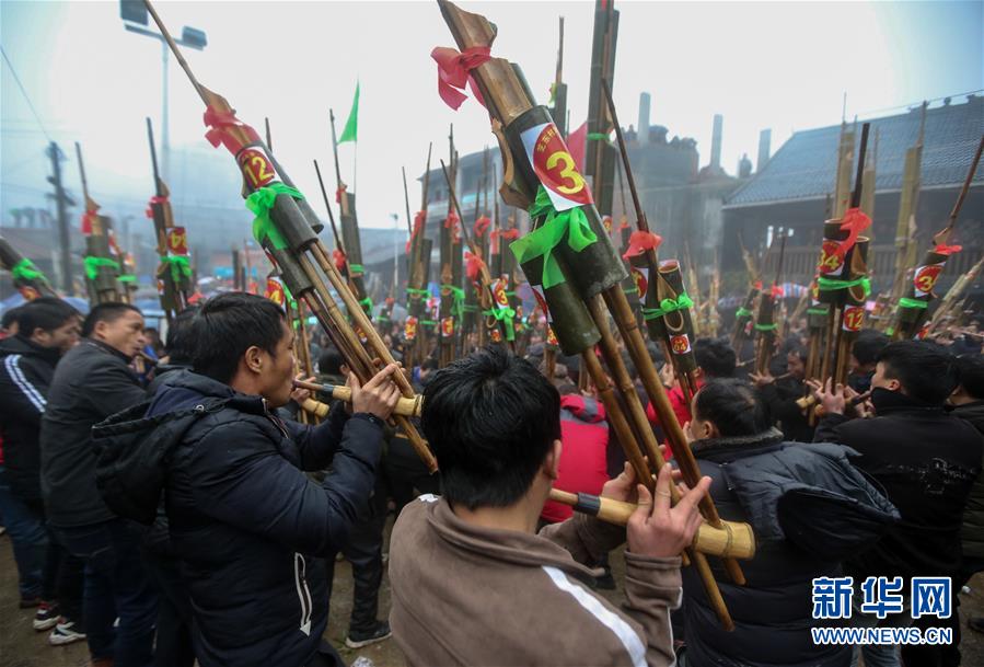1月14日,人們在廣西融水苗族自治縣紅水鄉(xiāng)舉行的蘆笙節(jié)上賽蘆笙。