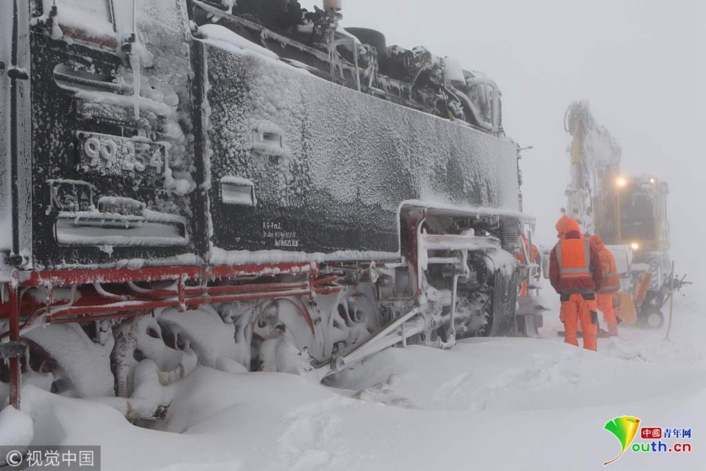 當(dāng)?shù)貢r(shí)間2019年1月9日,德國(guó)錫爾克,一輛蒸汽火車(chē)被大雪困住無(wú)法前進(jìn)。
