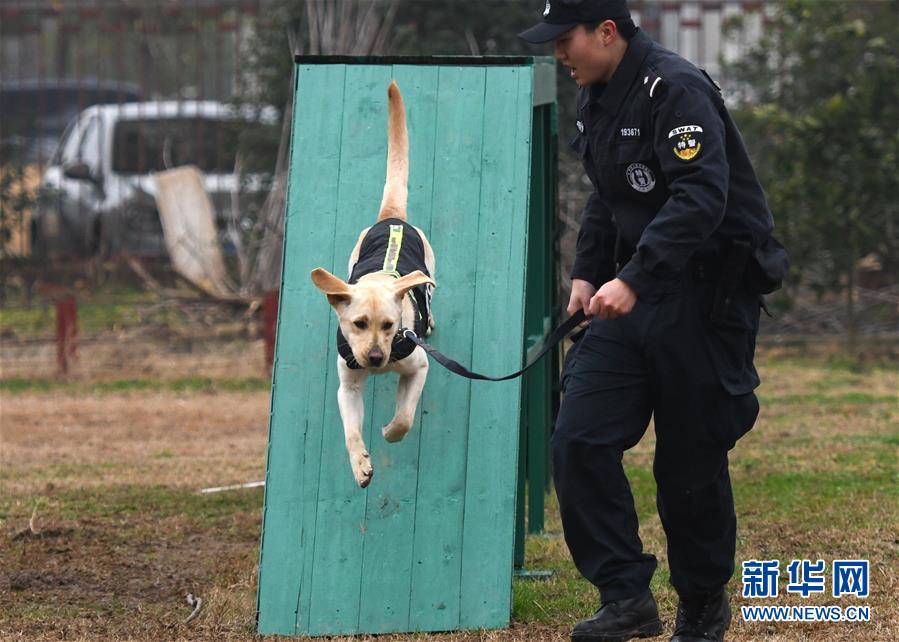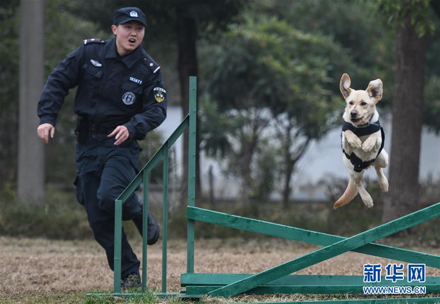 1月15日,警犬“皮特”在訓(xùn)導(dǎo)員丁巖的帶領(lǐng)下進(jìn)行崗前特訓(xùn)。 新華社記者 程敏 攝