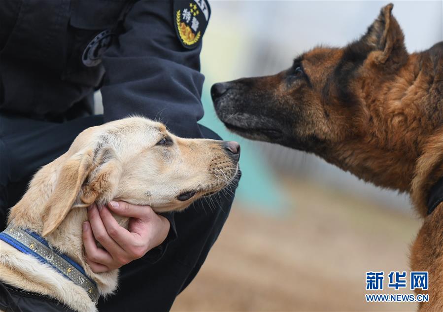 1月15日,即將組成搭檔的警犬“皮特”(前)與“哼哼”在一起。 新華社記者 程敏 攝