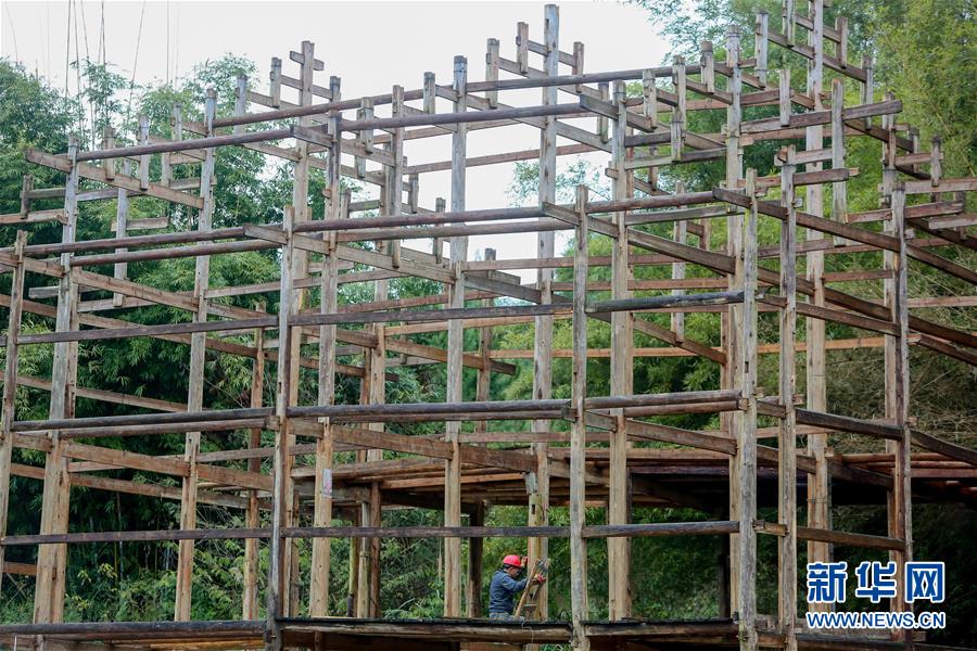 1月15日,在廣西融水苗族自治縣融水鎮(zhèn)夢(mèng)嗚苗寨,工人在吊腳樓的主要結(jié)構(gòu)上施工。新華社記者 陳君清 攝