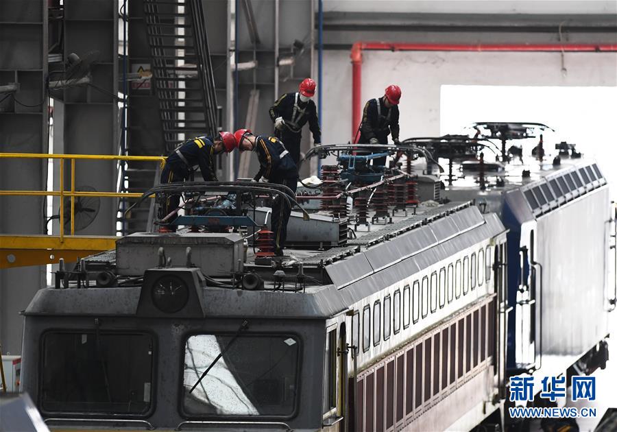 1月16日,重慶機務(wù)段職工在對機車車頂設(shè)備進(jìn)行檢修。 臨近春運,為確保春運旅客和貨物列車運輸安全,中國鐵路成都局集團(tuán)有限公司重慶機務(wù)段對全段機車進(jìn)行專項檢查、整修,為即將到來的春運做準(zhǔn)備。 新華社記者王全超攝