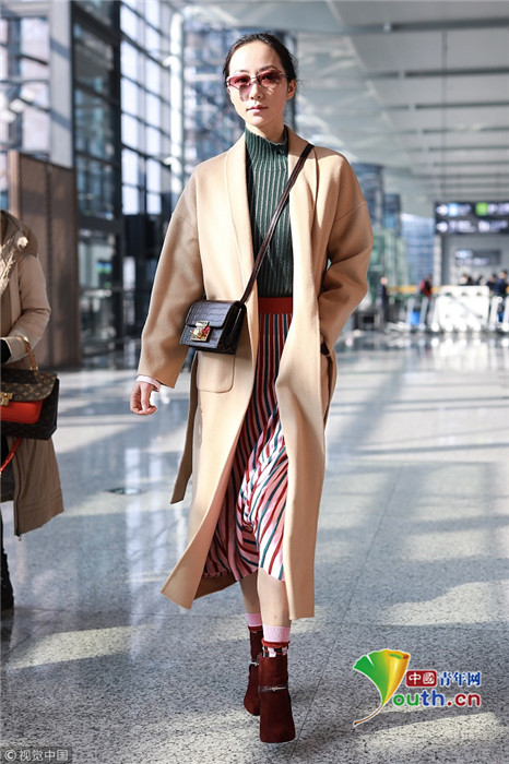 2019年1月17日,上海,韓雪現身機場,穿著條紋紗裙露出小腿,十分抗凍,她搭配經典的駝色大衣,氣質出眾在機場人群中相當搶鏡。