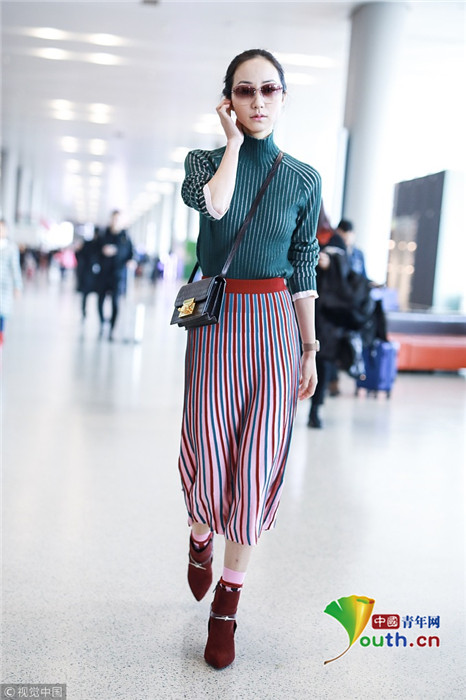 2019年1月17日,上海,韓雪現(xiàn)身機場,穿著條紋紗裙露出小腿,十分抗凍,她搭配經(jīng)典的駝色大衣,氣質(zhì)出眾在機場人群中相當(dāng)搶鏡。