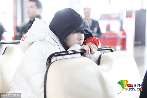 周冬雨連衣帽罩頭襯托小臉 下巴擱在行李車(chē)推桿呆萌可愛(ài)