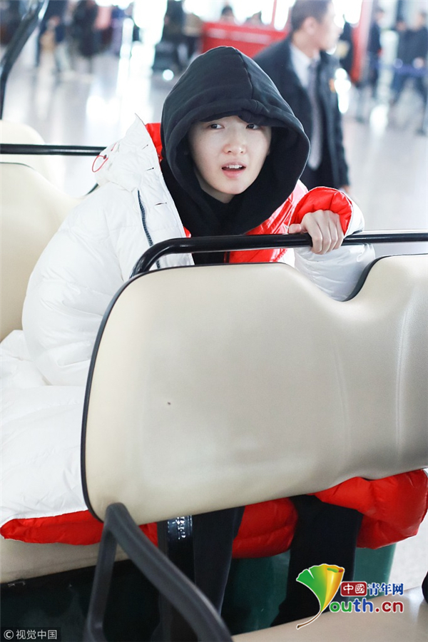 周冬雨連衣帽罩頭襯托小臉 下巴擱在行李車推桿呆萌可愛