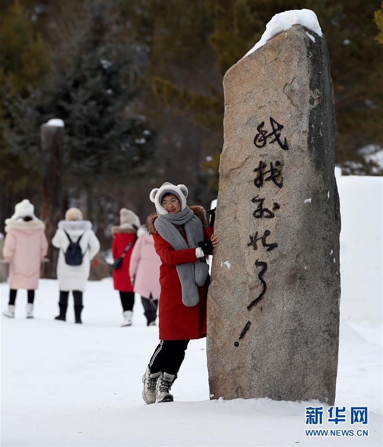 1月24日,在黑龍江省漠河市北極村,游客在“我找到北了”石碑旁留影。新華社記者王毓國攝