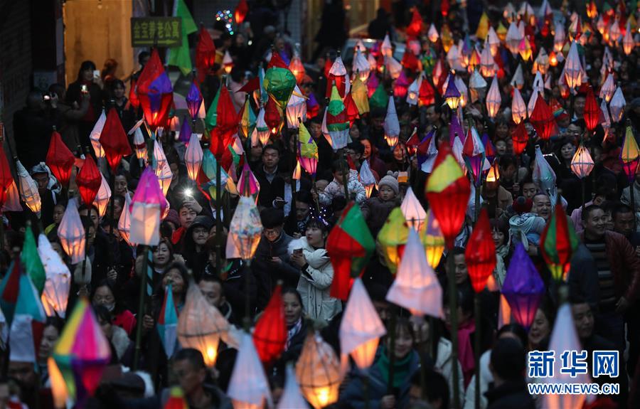 2月18日,在四川省南充市嘉陵區(qū)金寶鎮(zhèn),群眾舉著“蠐蟆燈”巡游。 當(dāng)日是農(nóng)歷正月十四,夜幕降臨后,川渝等地?cái)?shù)萬名群眾在四川省南充市嘉陵區(qū)金寶鎮(zhèn)匯聚,點(diǎn)亮“蠐蟆燈”,敲著鑼鼓唱著歌謠,將“蠐蟆”送到幾公里外的田邊或者河邊燒掉,祈福健康平安。星星點(diǎn)點(diǎn)的燈光在鄉(xiāng)間小路閃爍移動(dòng),場面壯觀熱烈。 “送蠐蟆”祈福這一習(xí)俗源于清朝,歷經(jīng)演變成為川東北地區(qū)一個(gè)古老而神秘的地方民俗節(jié)日。 新華社記者 江宏景 攝