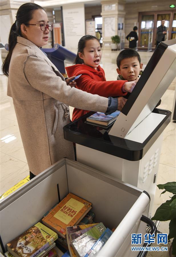 2月24日,一名家長帶孩子在府谷縣圖書館自助借還機上借閱圖書。 新華社記者 陶明 攝