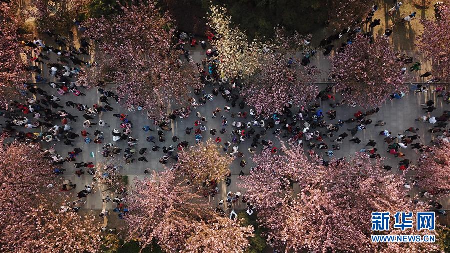 3月31日,游客在中國科學技術大學東區(qū)觀賞櫻花(無人機拍攝)。