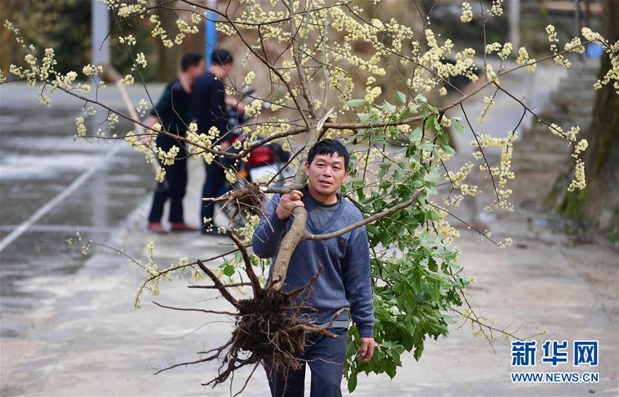 這是黔桂烏英苗寨的群眾在抬樹苗,準(zhǔn)備用來美化居住環(huán)境(3月16日攝)。