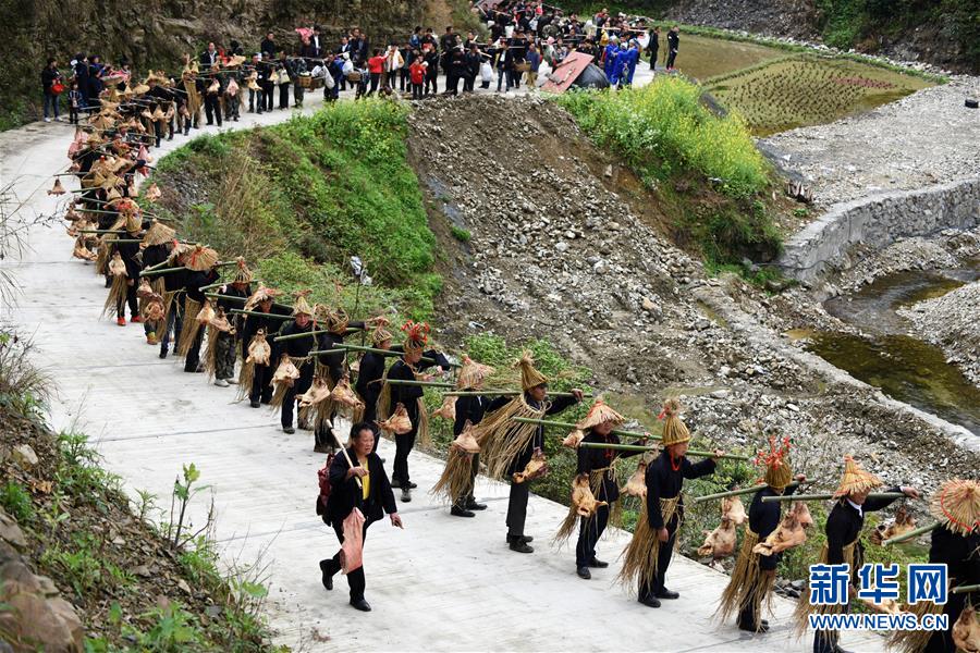 4月7日,苗族群眾挑著祭品走在祭“巫耶”儀式途中。4月6日至7日,在貴州省黔東南苗族侗族自治州劍河縣觀么鎮(zhèn)新民村和新合村,來(lái)自劍河縣和三穗縣的苗族同胞歡聚一堂,通過(guò)民族歌舞展演、非遺手工藝展示、千戶祭“巫耶”、跳蘆笙舞等形式,與來(lái)賓一起歡慶2019年高雍苗族“三月三”民俗文化節(jié)。 新華社記者 楊文斌 攝