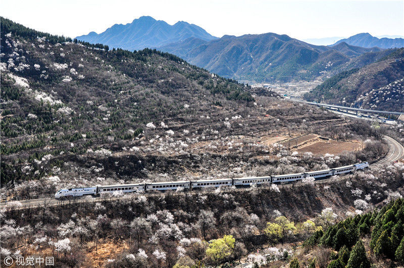 2019年3月22日,北京居庸關(guān)附近的山花盛開,S2線列車穿行在花海之中,構(gòu)成一幅美麗的畫面。