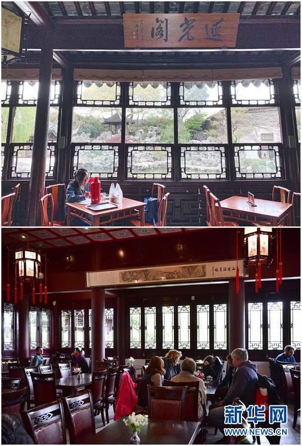 這張拼版照片展示的是:上圖,2019年4月2日,在中國蘇州藝圃,一名女子在延光閣內(nèi)學習(新華社記者杜涓涓攝);下圖,2019年4月13日,游客在德國曼海姆中式園林“多景園”內(nèi)的“多景樓”飲茶休憩(新華社記者逯陽攝)。