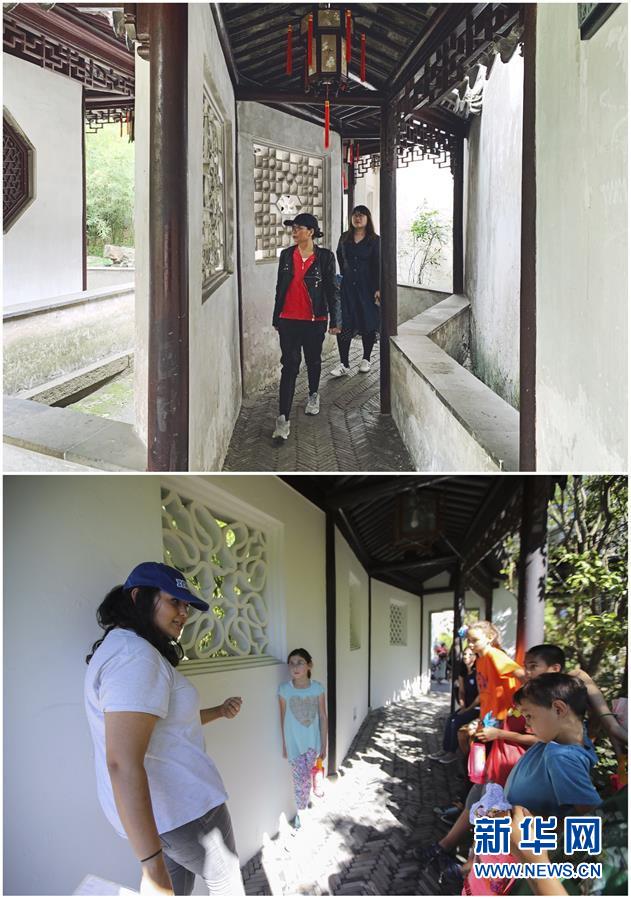 這張拼版照片展示的是:上圖,2019年4月2日,游客在中國蘇州留園內(nèi)游覽(新華社記者杜涓涓攝);下圖,2017年9月23日,在美國紐約寄興園舉行的迎中秋活動上,孩子們在志愿者的帶領下參觀(新華社記者王迎攝)。