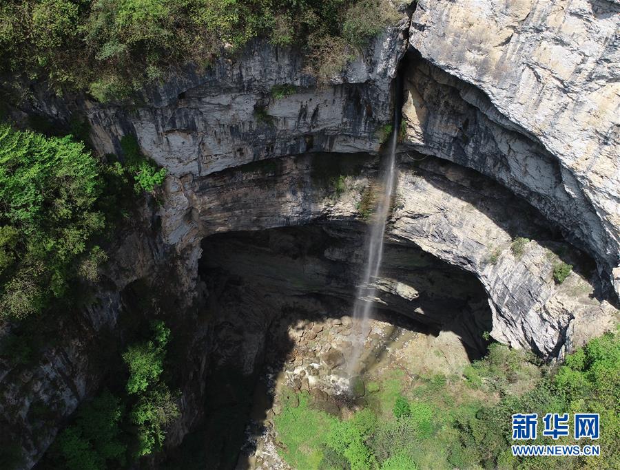 地洞河天坑底部的一處瀑布(4月22日攝)。位于陜西省漢中市寧強縣的地洞河天坑,是禪家?guī)r天坑群中規(guī)模最大的一處天坑,坑內分布有石鐘乳、石筍,具有極高的地質研究價值。 新華社記者 張博文 攝