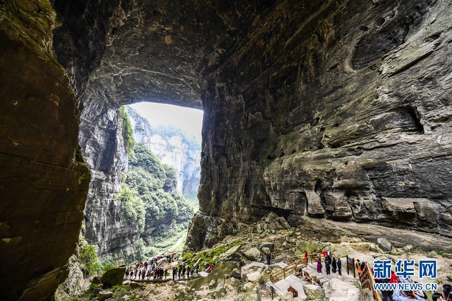 游客在天生三橋景區(qū)內的天龍橋景點游覽(3月27日攝)。 隨著天氣轉暖,重慶武隆天生三橋景區(qū)風景如畫,氣勢磅礴的天生石橋和綠意盎然的山林相映成趣,吸引眾多游客前來踏春賞景。 新華社記者劉潺攝