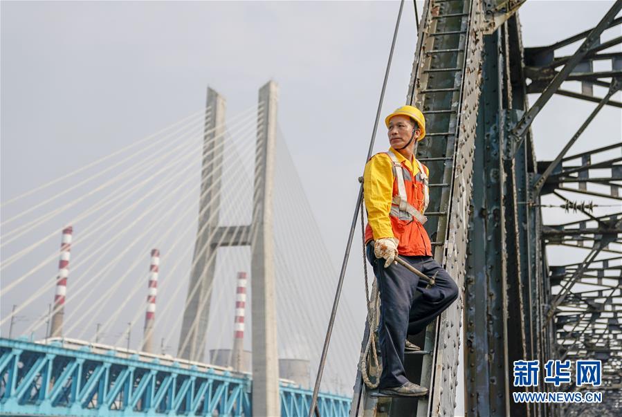 中國鐵路成都局有限公司重慶工務(wù)段53歲的橋隧工唐金華在白沙沱長江大橋的鋼架上檢查鋼梁的銹蝕情況(4月23日攝)。 4月23日下午5點(diǎn)40分,隨著重慶白沙沱長江大橋通行的最后一列客運(yùn)列車順利通過,這座“服役”了59年的重慶首座長江大橋進(jìn)入“退役”倒計時。4月24日后,所有列車將改線經(jīng)距白沙沱長江大橋約100米的新白沙沱長江特大橋通行,新橋“接力”老橋,運(yùn)輸能力將得到大幅提升。 白沙沱長江大橋于1958年開工,1960年通過首趟列車,是繼武漢長江大橋之后的第二座長江大橋。 新華社記者 劉潺 攝
