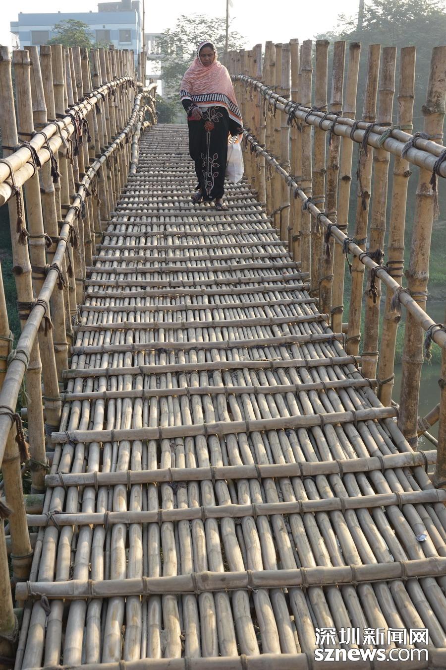 孟加拉國是一個(gè)洪水泛濫的國家,每到雨季,大部分地區(qū)都浸泡在一片汪洋大海中,只有那些建在高地上的小屋露出水面,為了便于交通,在屋子和公路之間,就搭起了一座座竹橋,短的不過十幾米,長的達(dá)上百米。李仁奇攝