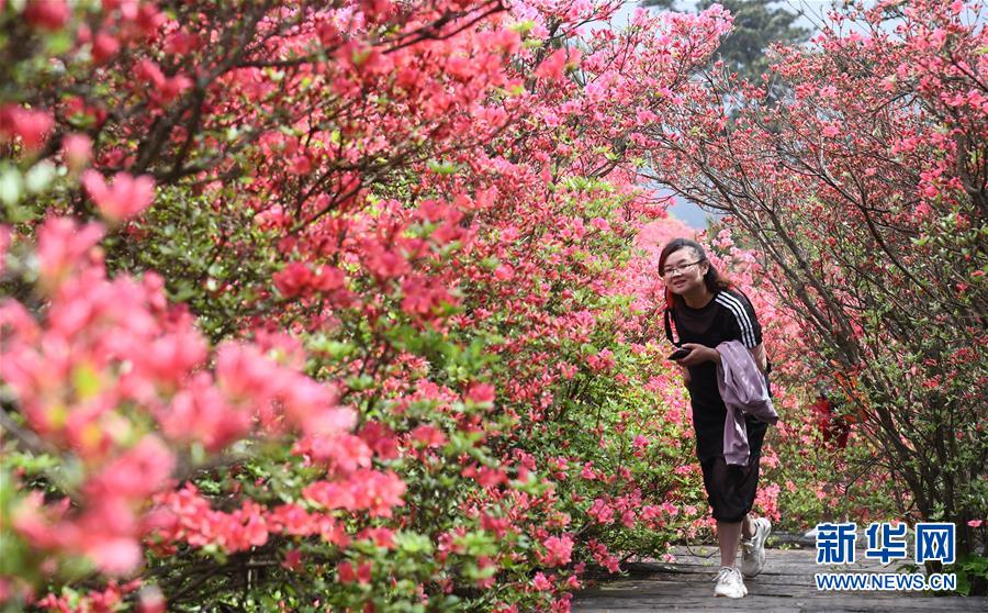 4月25日,游客在龜峰山杜鵑花海中游玩。 近日,湖北省麻城市龜峰山的10萬畝古杜鵑盛開,大量游客前來賞花觀景。 新華社記者 程敏 攝