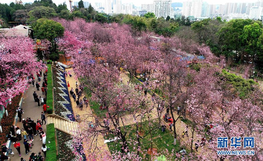 游人在云南昆明圓通山公園觀賞盛開的櫻花(3月16日無人機(jī)拍攝)。 新華社記者 秦晴 攝