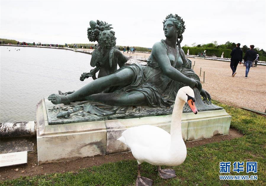 4月25日,在法國(guó)巴黎近郊的凡爾賽花園,一只白鵝站在青銅雕塑前。