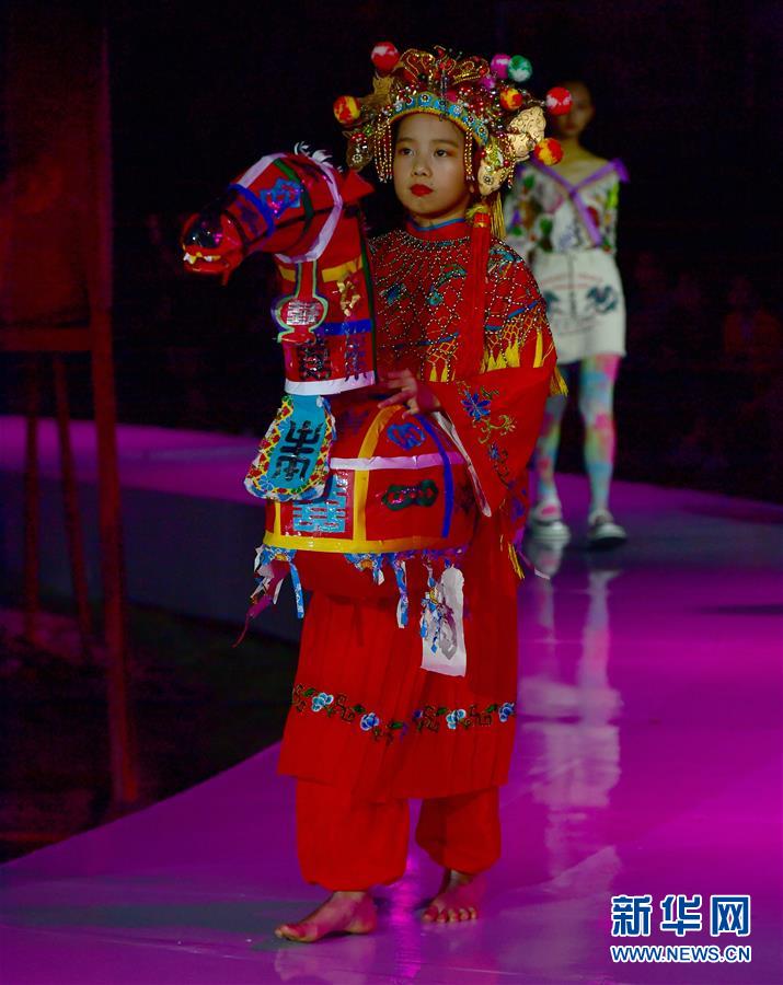 4月27日,小模特身穿民族服飾展示土樓當(dāng)?shù)氐姆俏镔|(zhì)文化遺產(chǎn)竹馬戲。 當(dāng)日,土樓光語國(guó)際時(shí)尚大秀在福建省南靖縣的土樓裕昌樓內(nèi)舉行。這場(chǎng)融匯文化、時(shí)尚與旅游元素的大秀,通過傳統(tǒng)與時(shí)尚的有機(jī)融合,展現(xiàn)南靖土樓及文化的魅力和風(fēng)采。 新華社記者魏培全攝