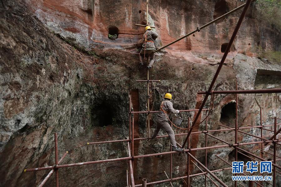中鐵西北科學研究院有限公司文保中心的工作人員對大佛巖體進行保護性清理(3月17日攝)。新華社記者 江宏景 攝