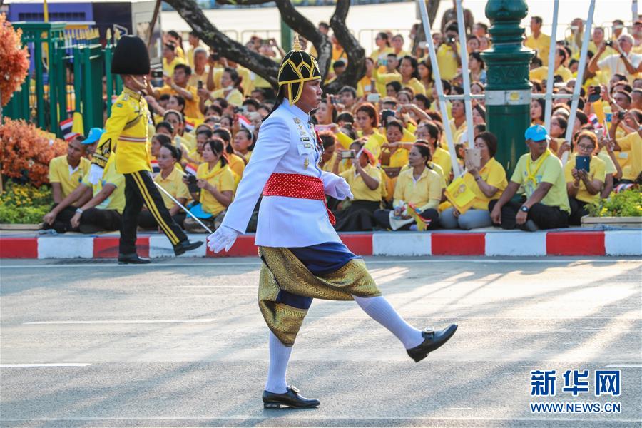 5月5日,儀仗隊(duì)在曼谷大王宮附近舉行的泰國國王加冕典禮巡游上列隊(duì)前進(jìn)。 新華社記者 張可任 攝