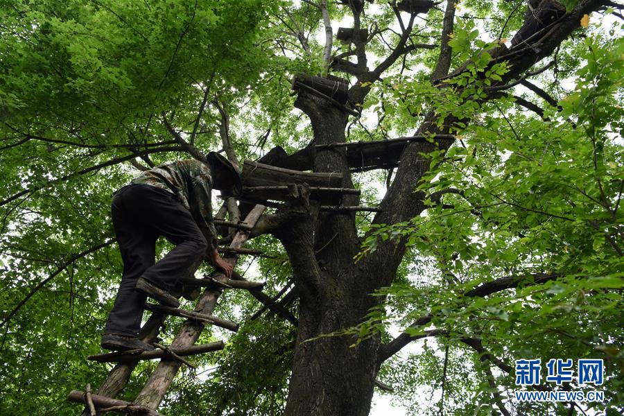 5月10日,在甘肅省隴南市徽縣大河店鎮(zhèn)硬灣村,蜂農(nóng)劉輝林準(zhǔn)備查看放在樹上的蜂箱情況。 甘肅省隴南市徽縣大河店鎮(zhèn)硬灣村位于秦巴山區(qū)深處,2017年,在當(dāng)?shù)卣姆龀窒?,龍崖老巢蜜養(yǎng)殖農(nóng)民專業(yè)合作社成立,蜂農(nóng)們將傳統(tǒng)養(yǎng)蜂技藝和現(xiàn)代加工方式相結(jié)合,并通過電商等渠道打開銷路,有效帶動(dòng)了當(dāng)?shù)刎毨Т迕衩撠氈赂弧D壳罢麄€(gè)合作社共有蜂箱2000余個(gè),每箱每年可帶來三四千元的收入。 新華社記者 馬寧 攝