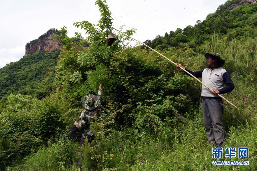 5月10日,在甘肅省隴南市徽縣大河店鎮(zhèn)硬灣村,蜂農(nóng)周仲頤(右)在收蜂。 甘肅省隴南市徽縣大河店鎮(zhèn)硬灣村位于秦巴山區(qū)深處,2017年,在當(dāng)?shù)卣姆龀窒?,龍崖老巢蜜養(yǎng)殖農(nóng)民專業(yè)合作社成立,蜂農(nóng)們將傳統(tǒng)養(yǎng)蜂技藝和現(xiàn)代加工方式相結(jié)合,并通過電商等渠道打開銷路,有效帶動了當(dāng)?shù)刎毨Т迕衩撠氈赂?。目前整個合作社共有蜂箱2000余個,每箱每年可帶來三四千元的收入。 新華社記者 馬寧 攝