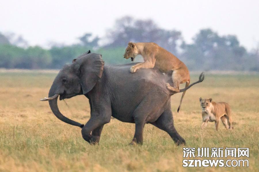 英國攝影師詹姆斯(James Gifford)在博茨瓦納喬貝國家公園拍到一群獅子獵食大象的精彩畫面。在詹姆斯的鏡頭下,一頭母獅跳到了一頭小象的背上想要將其拿下,但僅憑一己之力又不能做到。但當(dāng)母獅的后援抵達(dá)時(shí),象群也趕到了現(xiàn)場。最終,小象回到了象群中獲得庇護(hù),而獅群也不得不悻悻離去。