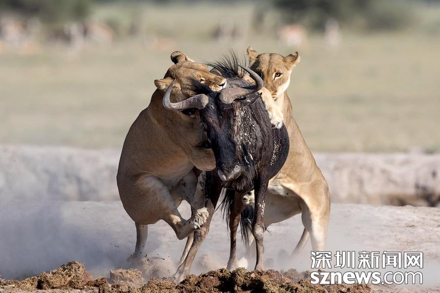 英國(guó)攝影師蘇-莫里斯(Sue Morri)在博茨瓦納Nxai Pan國(guó)家公園游玩,目睹了一場(chǎng)兇惡母獅獵食角馬的畫(huà)面。母獅甚至攀到了角馬背上,想要牢牢遏制住到手的“美餐”。強(qiáng)壯的角馬努力地與母獅抗?fàn)帲吡ο胍W∽约旱男悦?,但最終還是不敵母獅被拿下,最后成了母獅孩子們的盤(pán)中餐。