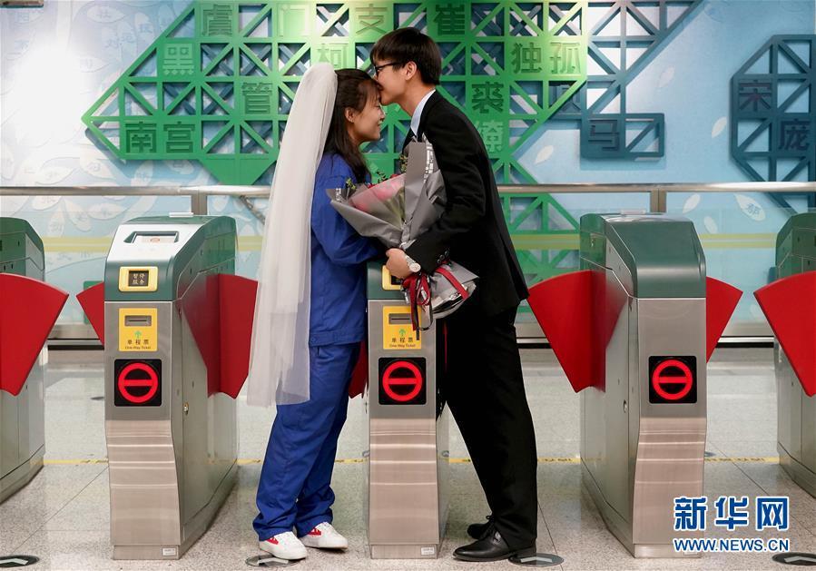 5月20日,兩名參與地鐵5號線建設的工作人員在求婚后拍照留念。 當日,鄭州地鐵5號線開始初期運營。作為鄭州軌道交通線網中首條環(huán)線,5號線全長40余公里,設站32座。 新華社記者李安攝