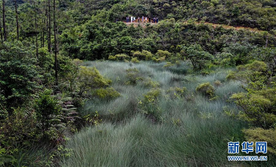 6月1日,游人在香山古驛道旁欣賞富有野趣的“煙波潮涌”景色(無(wú)人機(jī)拍攝)。