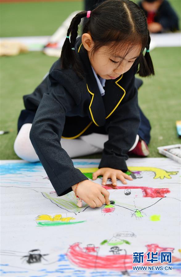 6月5日,陜西師范大學附屬小學的學生在長卷上畫龍舟。