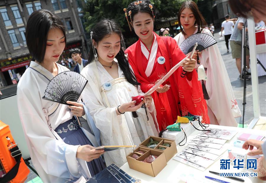 6月9日,在成都寬窄巷子,幾位漢服愛好者在香包、茶器等展臺(tái)駐足。新華社記者 江宏景 攝