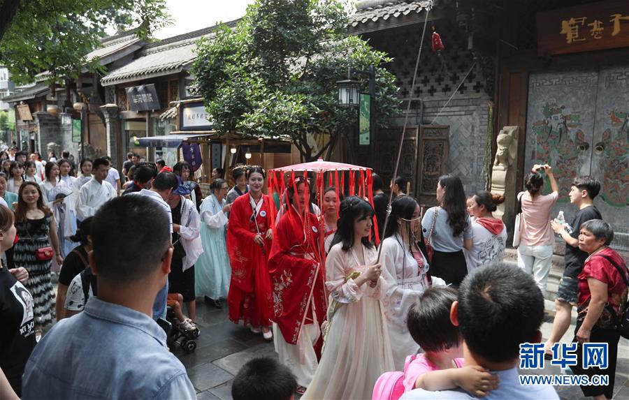 6月9日,在成都寬窄巷子,漢服愛好者表演舞蹈。