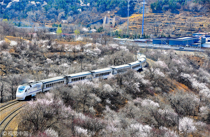 2019年3月22日,北京居庸關(guān)附近的山花盛開(kāi),S2線列車穿行在花海之中,構(gòu)成一幅美麗的畫(huà)面。