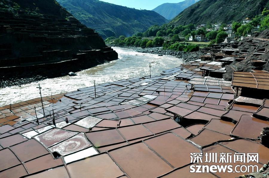 西藏芒康縣納西民族鄉(xiāng)加達村村民在鹽田曬鹽(6月4日攝)。新華社記者晉美多吉攝